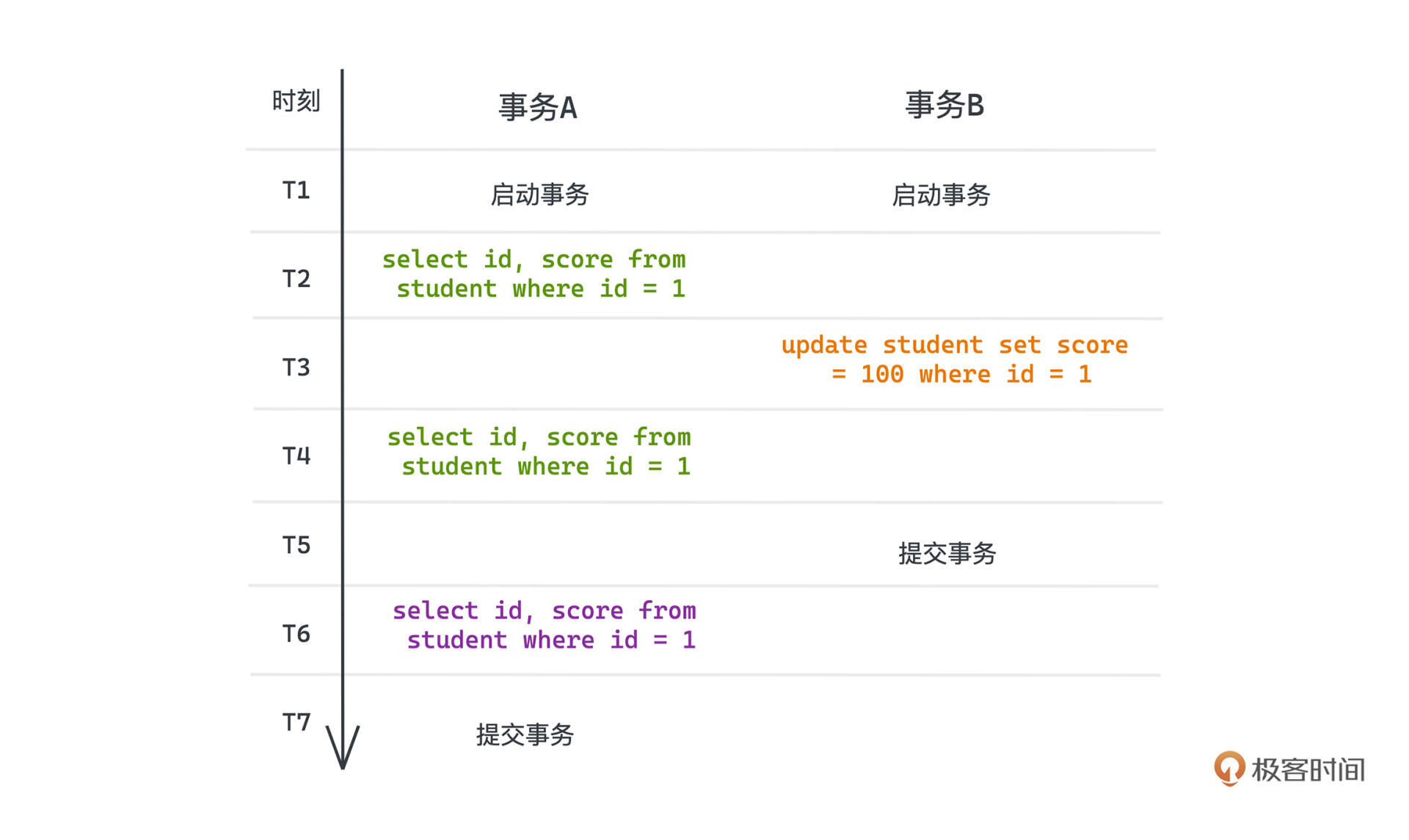 在读提交的隔离等级下,T2还是读到50,这次在T4的时候我们不再会读到脏值100,但在T5事务B已经提交的时候,T6再去读同一个记录,会读到事务B提交之后更新的值100。这个时候,在同一个事务里,两次读到的数据就出现了不一致的情况,也就是仍然会出现不可重复读,但已经不会出现脏读的情况了。