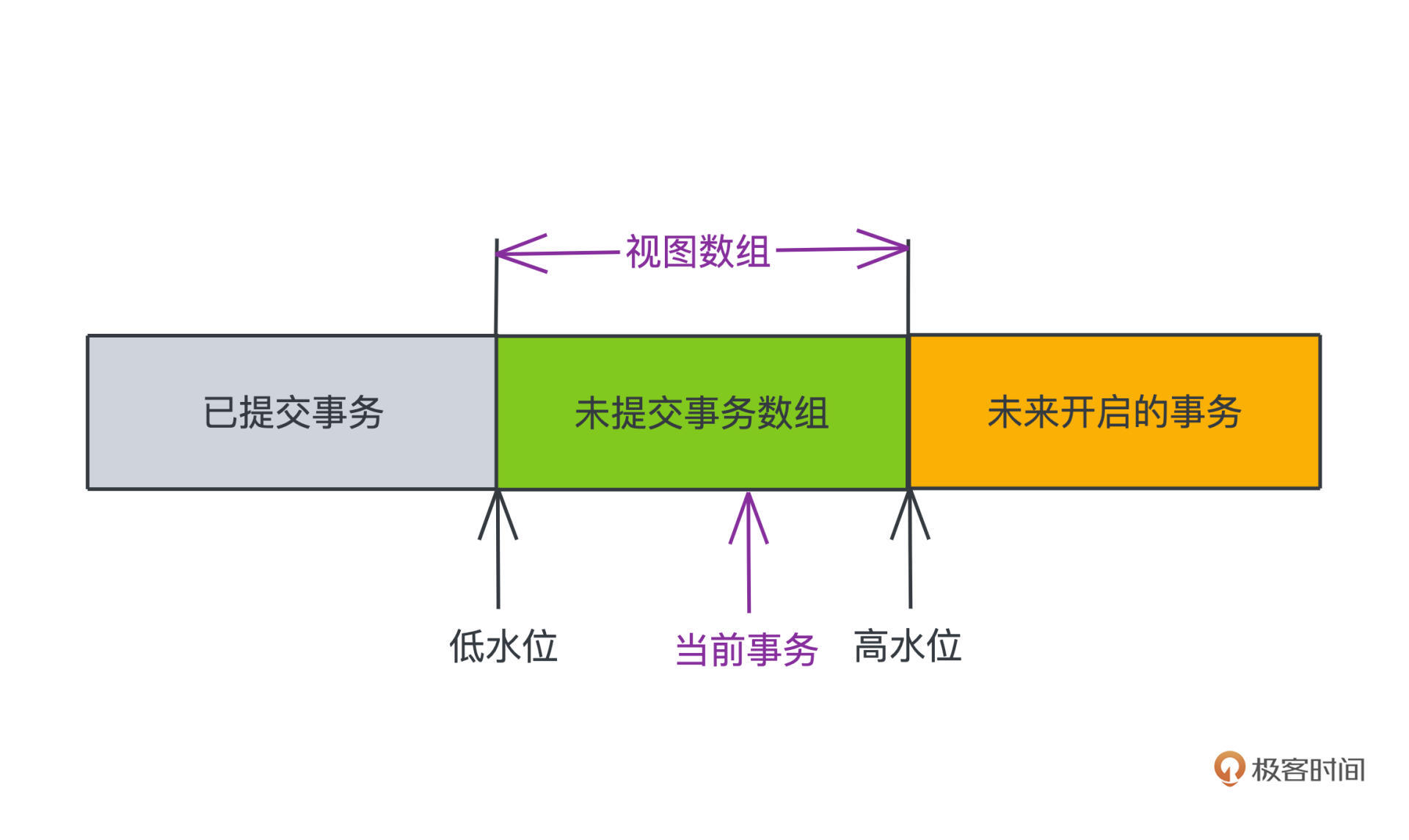 这两个ID其实就可以从当前执行的事务的视角,将所有的事务分为三个部分,小于低水位的部分一定是当前事务开始前就提交了的部分,大于等于高水位的则一定是还未提交的事务,我们一定不可见。