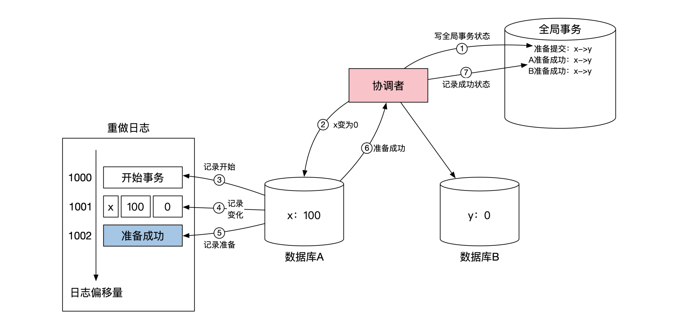 当数据库 A 将对 x 的操作记录到重做日志之后,会在重做日志里记录一个 准备成功 的标记,然后返回给协调者自己已经准备成功的消息。数据库 B 的情况完全一样,所以这里我没有画出来。