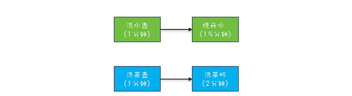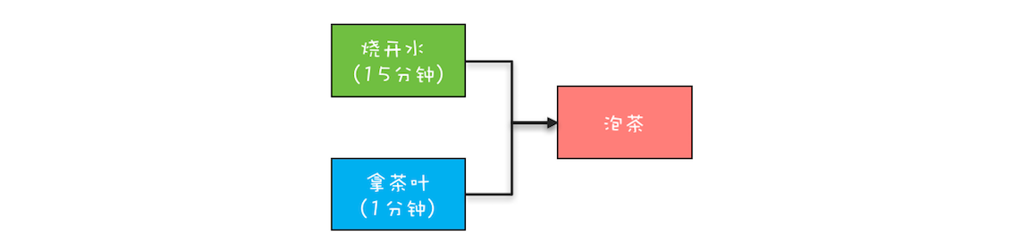 我觉得,你可以站在分工的角度类比一下工作流。任务是有时序关系的,比如有串行关系、并行关系、汇聚关系等。这样说可能有点抽象,这里还举前面烧水泡茶的例子,其中洗水壶和烧开水就是串行关系,洗水壶、烧开水和洗茶壶、洗茶杯这两组任务之间就是并行关系,而烧开水、拿茶叶和泡茶就是汇聚关系。
