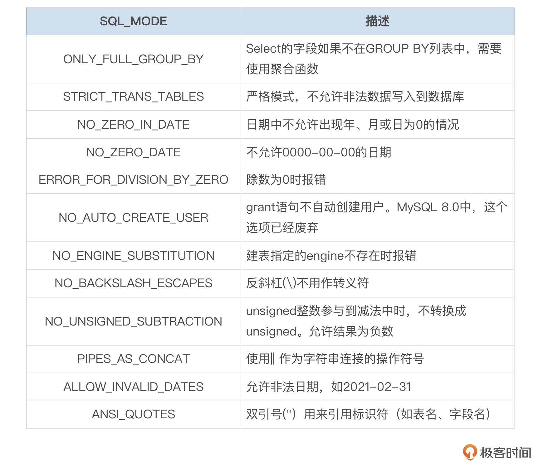 下面这个表格对一些SQL Mode的作用做了简单总结,你可以参考。