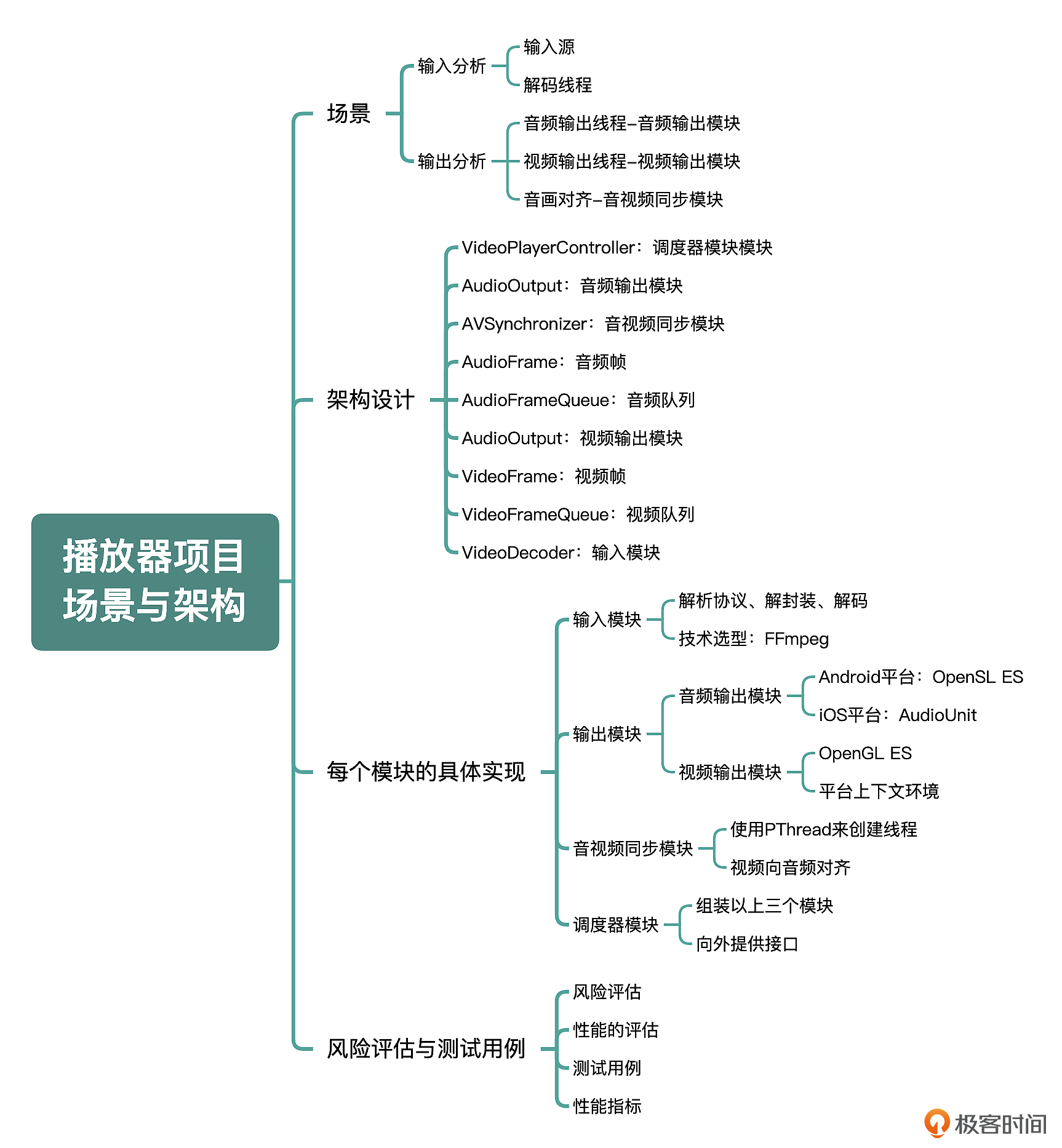 那接下来再看输出是什么,输出就是让用户可以听到、看到这个视频,也就是可以把视频中的音频播放出来,同时把视频画面渲染到屏幕上,并且让声音和画面同步播放出来,这样我们进一步确定了输出;最后一步我们根据输入和输出来拆分模块,并给模块分配合理的职责,其实就是需要将输入资源和掌握的音视频能力进行合理的规划和使用,来实现最终的输出结果,但这个问题相比前两个问题要复杂得多,我会带着你来慢慢分析。
