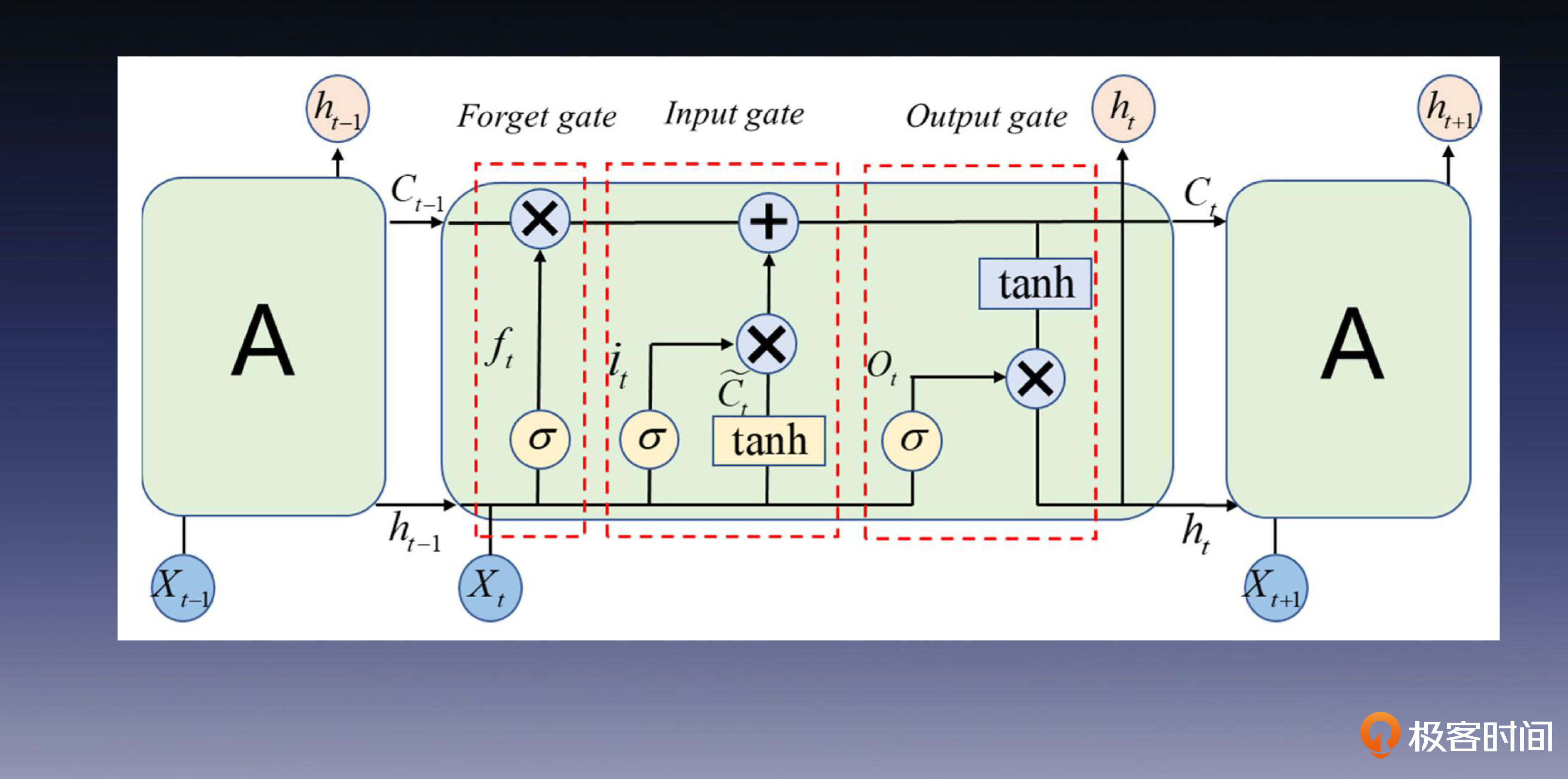 我们继续回到 LSTM 的主题,结合上面的这张图,你会发现,我们引入的$C_t$这条链路扮演着记忆细胞的角色,负责传递着各个门和单元之间的信息。虽然之前的 RNN 也可以依靠$h_t$这条链路来传递局部的时序语义关系,但是记忆细胞可以捕捉并传递更长序列的语义关系,这能帮助模型更好地建模长距离依赖的关系。