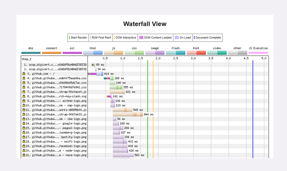 网站测试的最终结果是一个直观的“瀑布图”(Waterfall Chart),清晰地列出了页面中所有资源加载的先后顺序和时间消耗,比如下图就是对GitHub首页的一次测试。