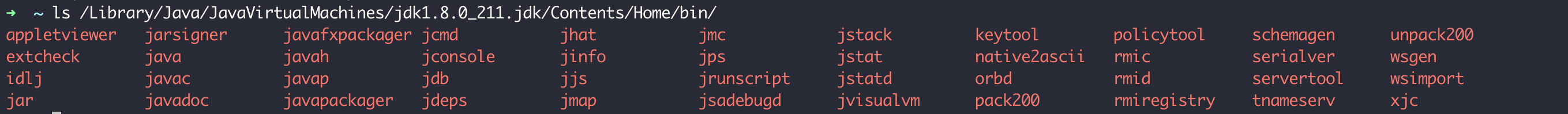 使用JDK自带工具查看JVM情况 JDK自带了很多命令行甚至是图形界面工具,帮助我们查看JVM的一些信息。比如,在我的机器上运行ls命令,可以看到JDK 8提供了非常多的工具或程序: