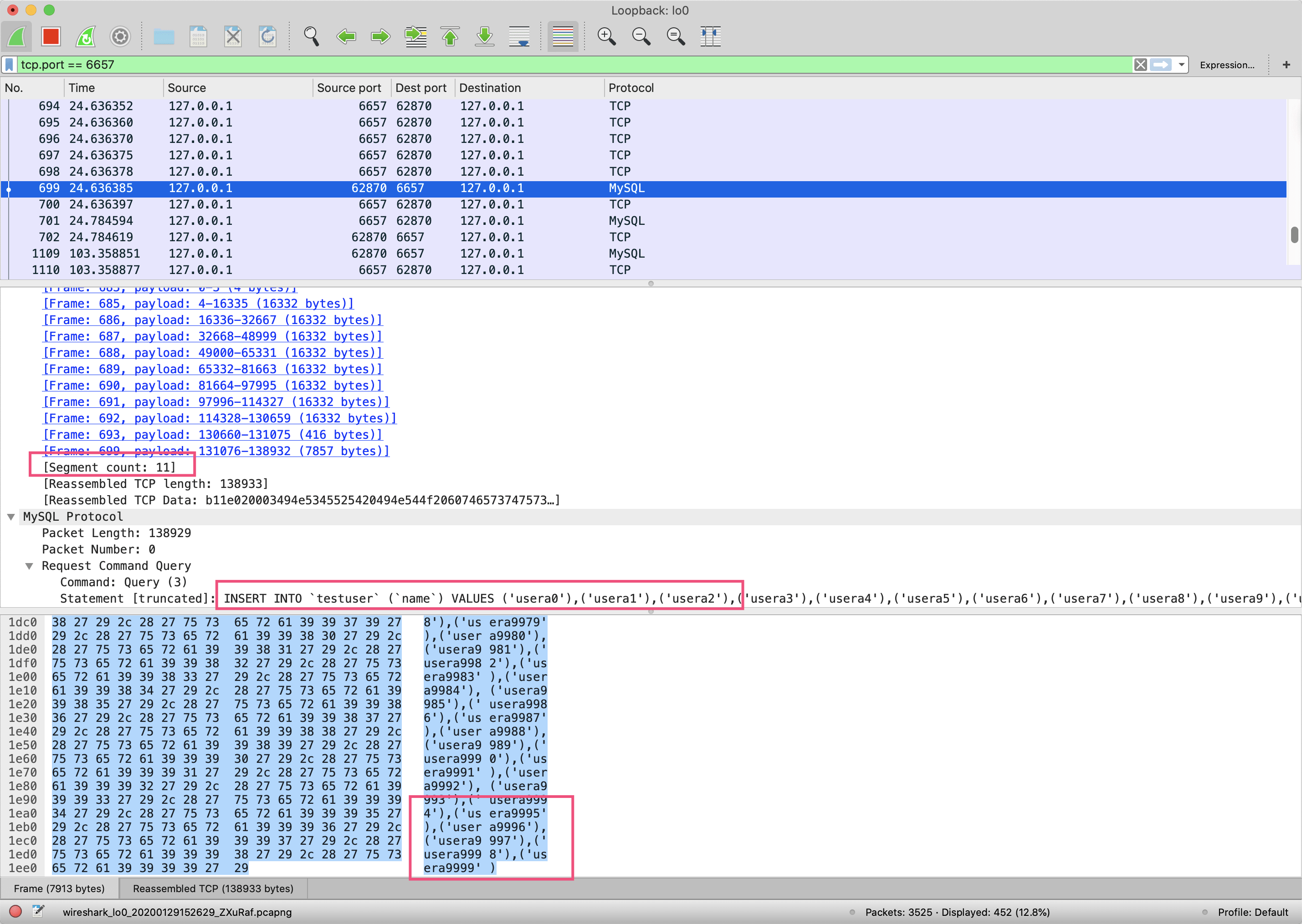 这次insert SQL语句被拼接成了一条语句(如第二个红框所示); 这个TCP包因为太大被分割成了11个片段传输,#699请求是最后一个片段,其实际内容是insert语句的最后一部分内容(如第一和第三个红框显示)。