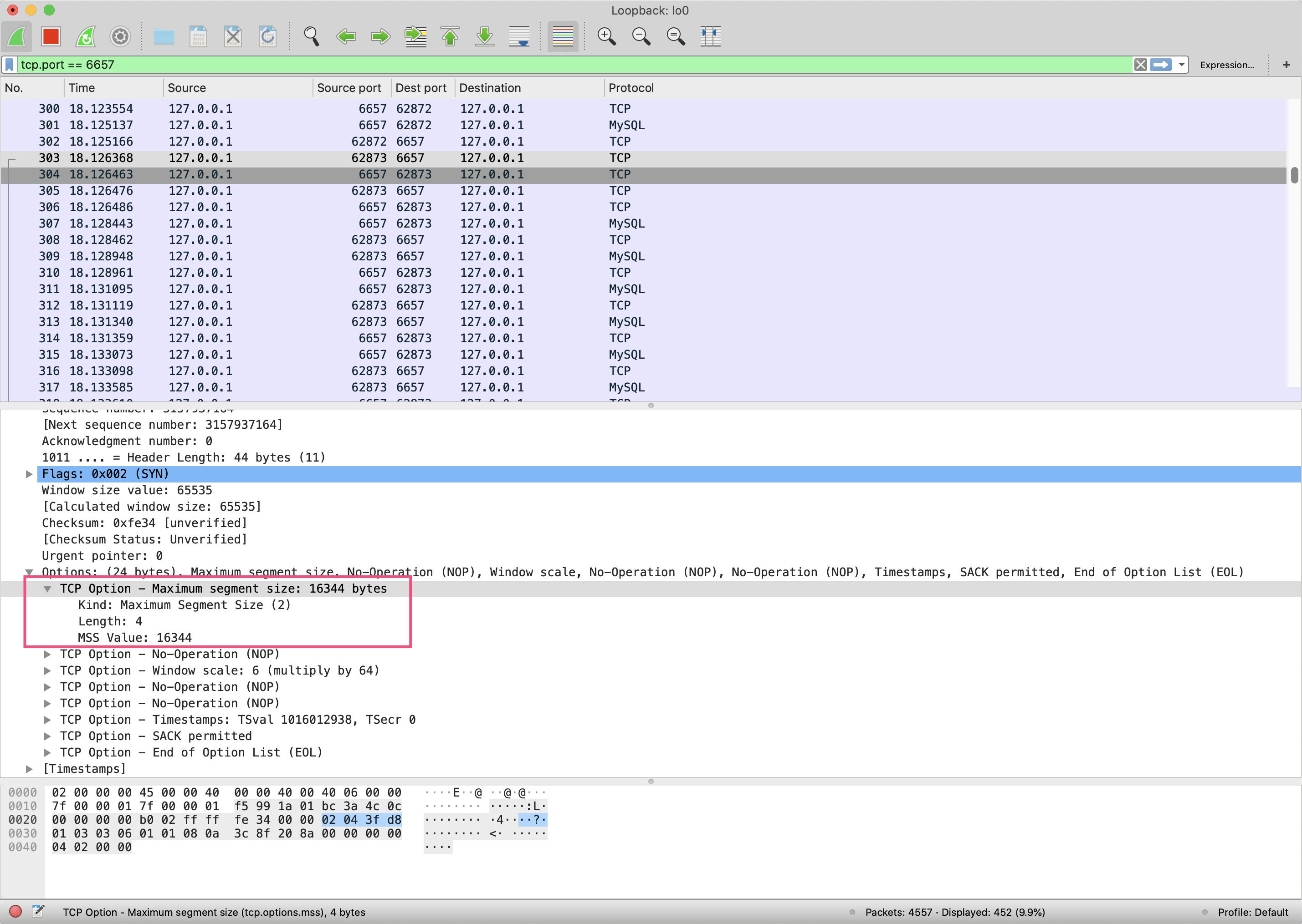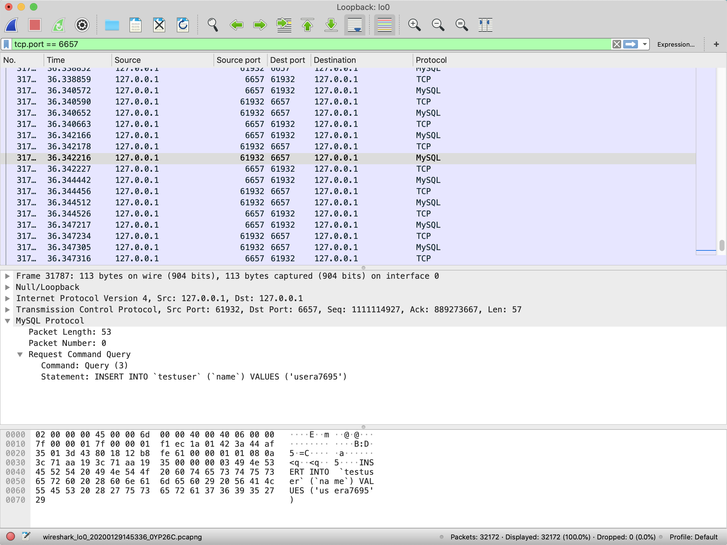 然后,Wireshark捕捉这个网卡的所有网络流量。我们可以在上方的显示过滤栏输入tcp.port == 6657,来过滤出所有6657端口的TCP请求(因为我们是通过6657端口连接MySQL的)。