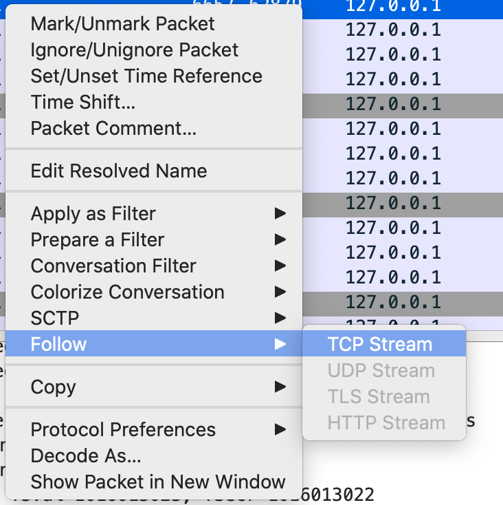 为了查看整个TCP连接的所有数据包,你可以在请求上点击右键,选择Follow->TCP Stream:
