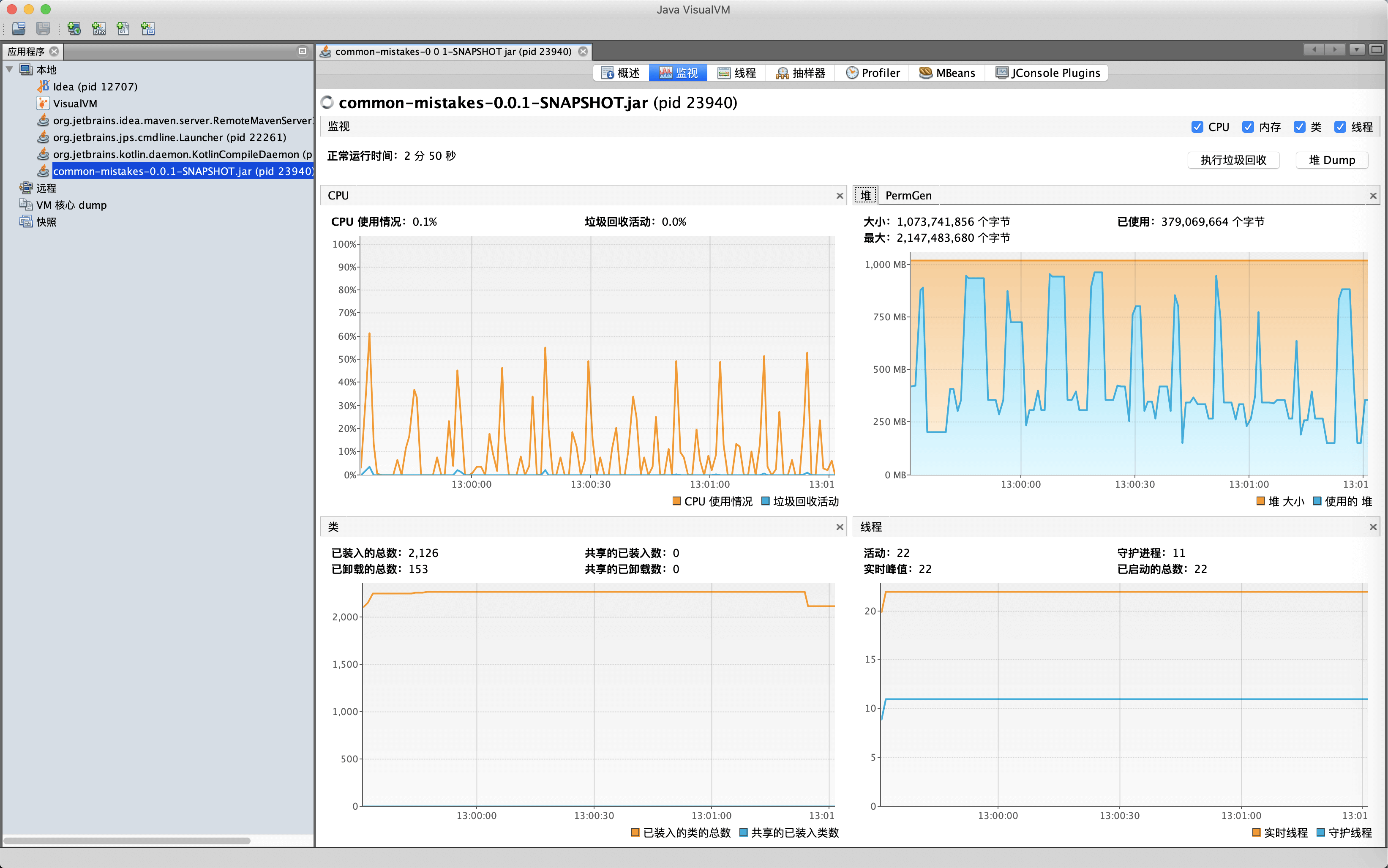继续观察监视面板可以看到,JVM的GC活动基本是10秒发生一次,堆内存在250MB到900MB之间波动,活动线程数是22。我们可以在监视面板看到JVM的基本情况,也可以直接在这里进行手动GC和堆Dump操作: