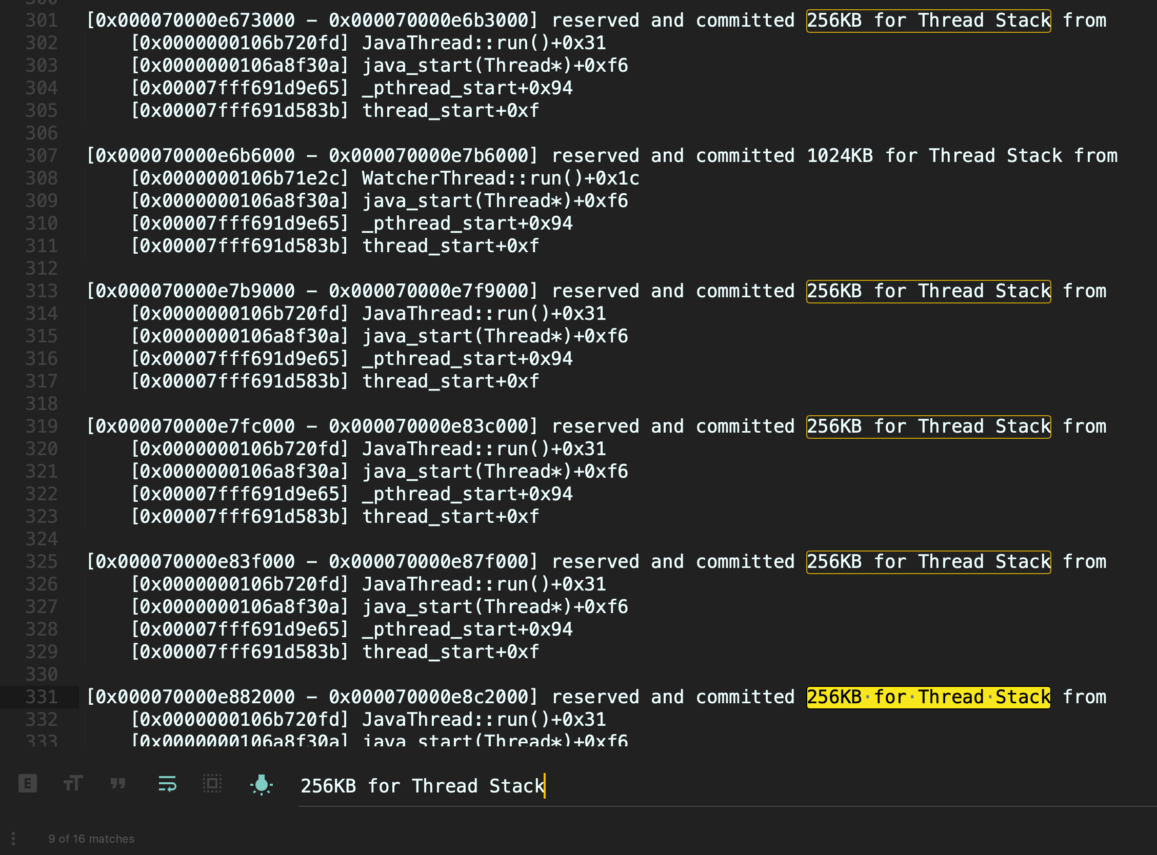 可以看到,有16个可疑线程,每一个线程保留了262144KB内存,也就是256MB (通过下图红框可以看到,使用关键字262144KB for Thread Stack from搜索到了16个结果):