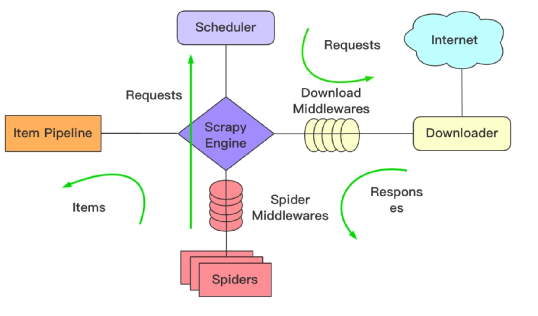 我们还是先来看看这张经典的流程图。在上一节课中,我们在爬虫代码的parse_namedetail()函数中yield出去了一个Item,这个yield出去的Item实际上会被传入到Item Pipeline中,而这个Item Pipeline实际上就是对应着我们刚刚的pipelines.py文件。