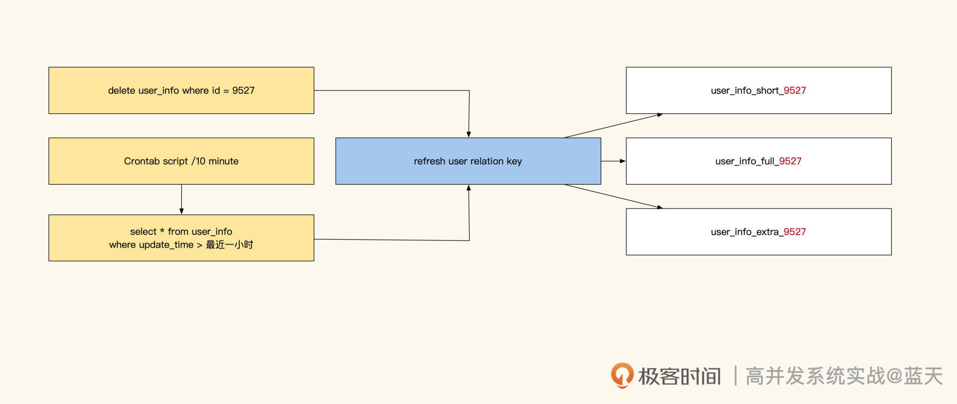 最后,我再给你介绍一种方式:异步脚本遍历数据库刷新所有相关缓存。这个方式适用于两个系统之间同步数据,能够减少系统间的接口交互;缺点是删除数据后,还需要人工删除对应的缓存,所以更新会有延迟。但如果能配合订阅更新消息广播的话,可以做到准同步。