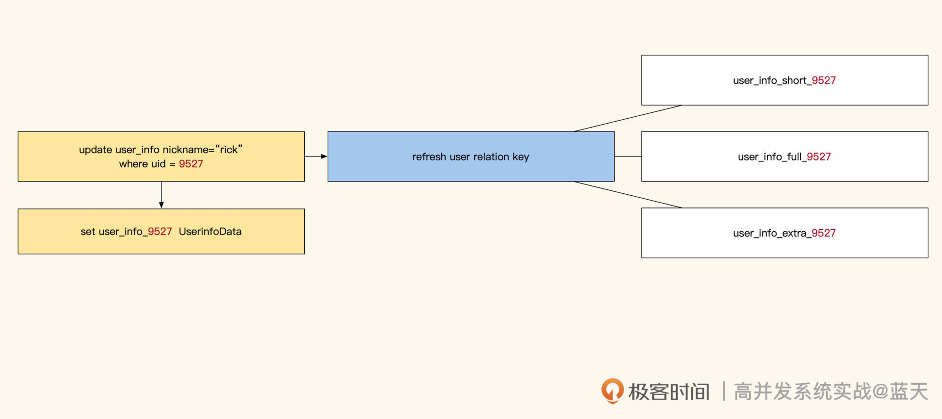 单条实体数据缓存更新是最简单的一个方式,比如我们缓存了9527这个用户的info信息,当我们对这条数据做了修改,我们就可以在数据更新时同步更新对应的数据缓存: