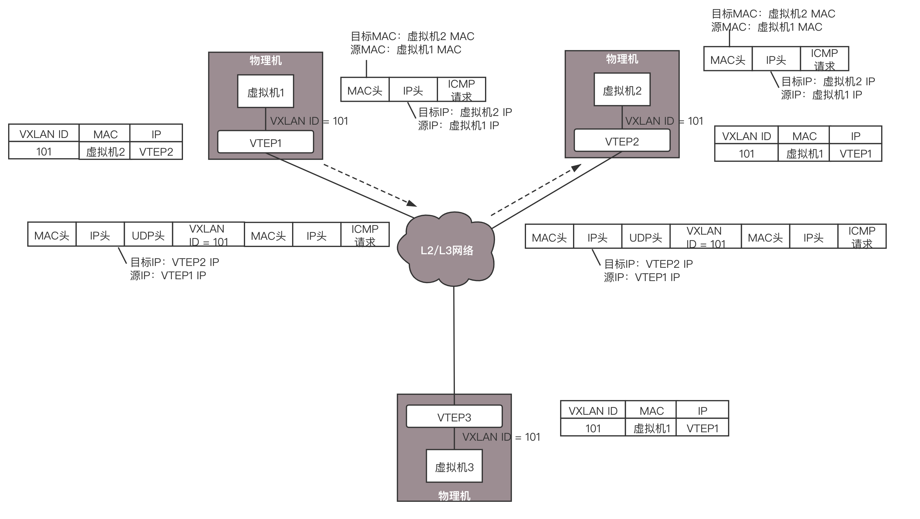 虚拟机2回复的包,到达VTEP2的时候,它当然也记得刚才学的东西,要找虚拟机1,就去VTEP1,于是将包封装在VXLAN里面,外层加上VTEP1和VTEP2的IP地址,也发送出去。