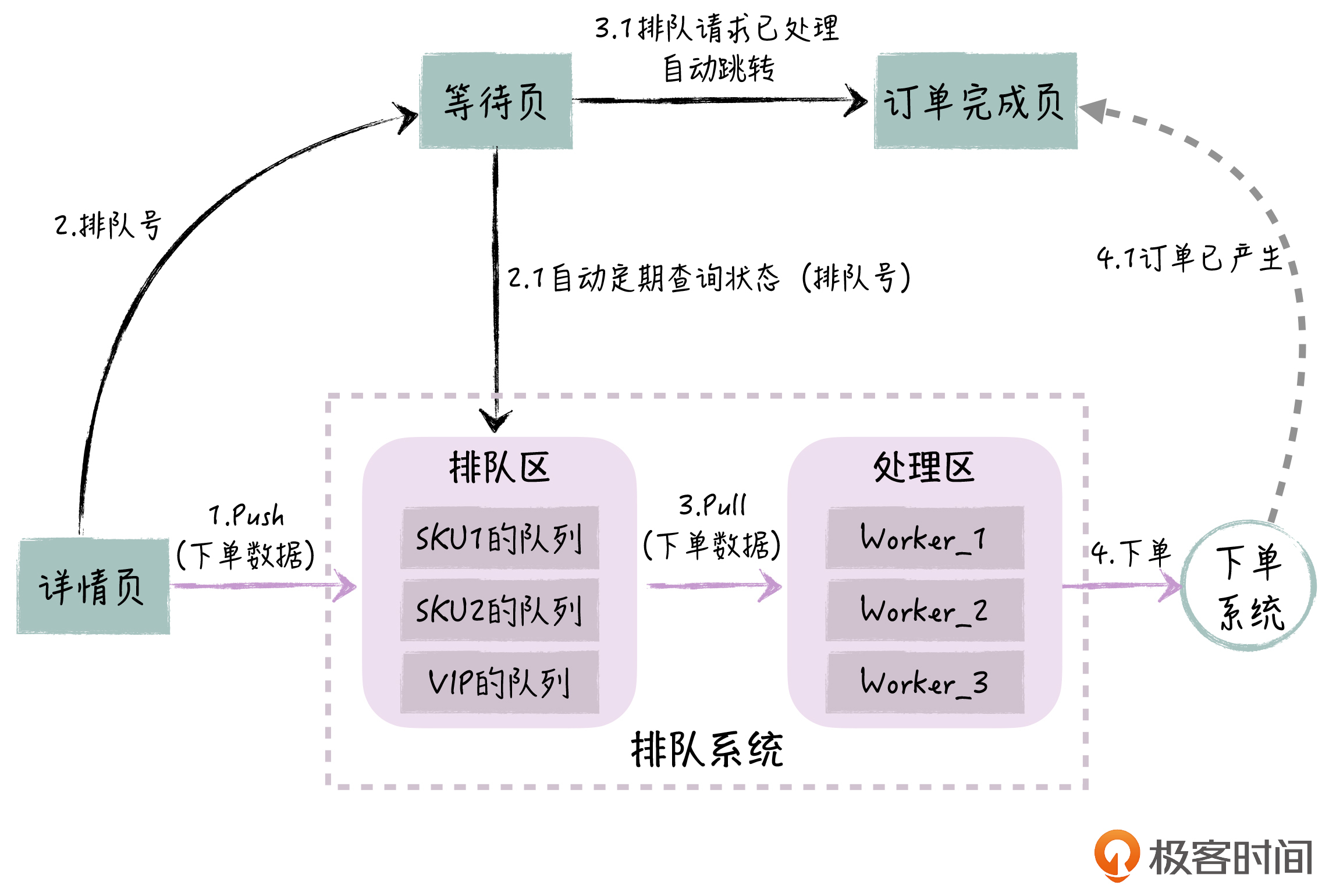 - 用户在商品详情页提交订单后,这个订单会作为预订单进入排队区,同时排队系统会返回用户一个排队编号,这个编号用于跟踪后续的订单处理进度;