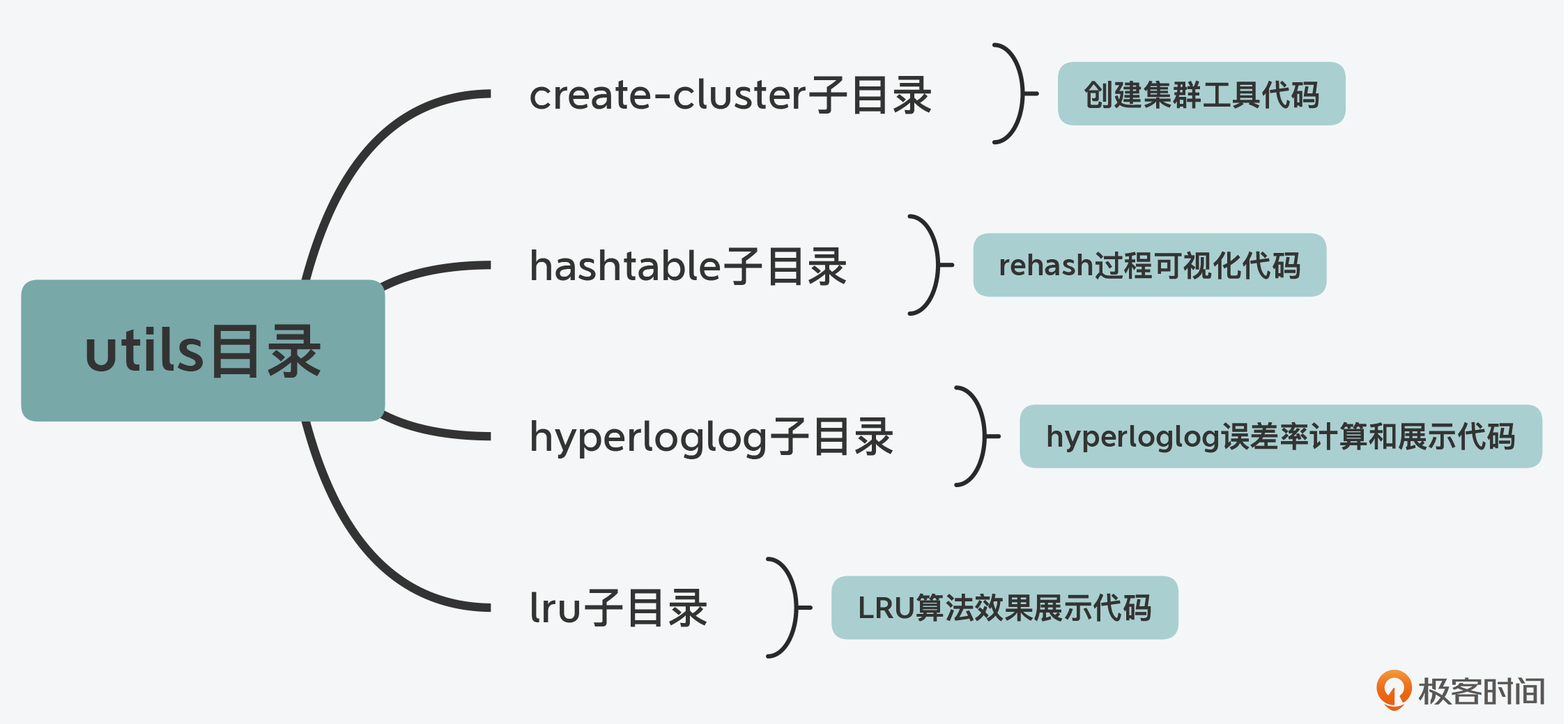 在Redis开发过程中,还有一些功能属于辅助性功能,包括用于创建Redis Cluster的脚本、用于测试LRU算法效果的程序,以及可视化rehash过程的程序。在Redis代码结构中,这些功能代码都被归类到了utils目录中统一管理。下图展示了utils目录下的主要子目录,你可以看下。