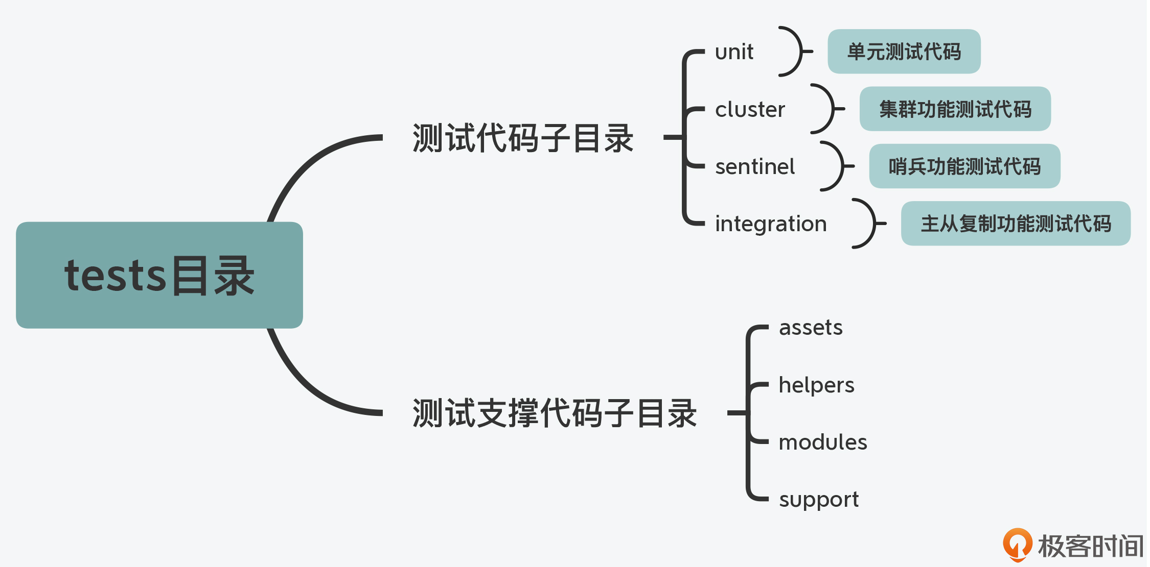 不过在tests目录中,除了有针对特定功能模块的测试代码外,还有一些代码是用来支撑测试功能的,这些代码在assets、helpers、modules、support四个目录中。这里我画了这张图,展示了tests目录下的代码结构和层次,你可以参考下。