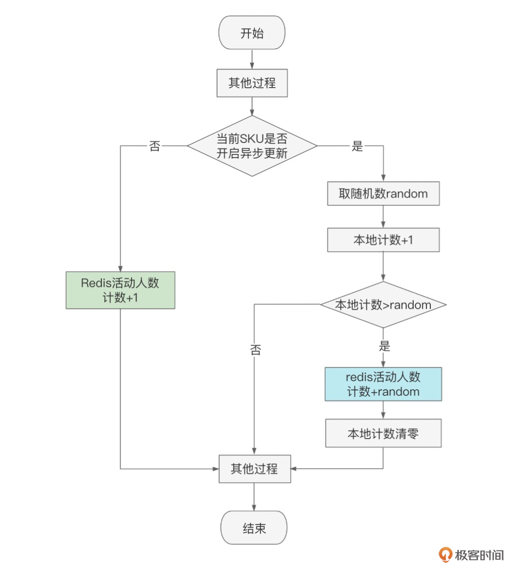 介绍完读热点,接下来我们看写热点问题。我们先回忆一下,在[第6讲]流量管控里,我们介绍到用户点击“立即预约”的时候,会往“预约人数”这个Redis key上进行++操作,当几百万人同时预约的时候,这个key就是热点写操作了。