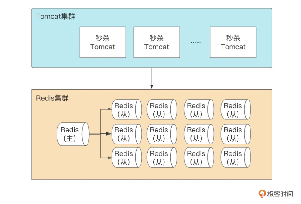 以上是秒杀系统的部署结构图,参照解决思路,我们的第一个解决方案,就是增加Redis从的副本数,然后业务层(Tomcat集群)轮询查询不同的副本,提高同一数据的QPS。一般情况下,单个Redis从,可提供8~10万的查询,所以如果我们增加12个副本,就可以提供百万QPS的热点查询。