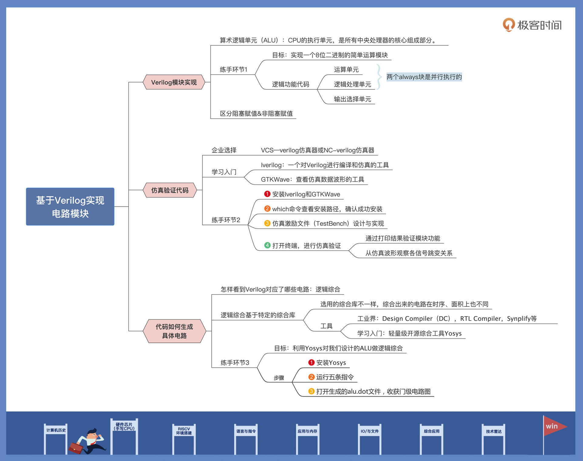 今天我们一起了解了怎么把Verilog代码变为具体的电路。为了实现代码编写、验证和仿真的“一站式”体验。我还向你推荐了几个开源软件。我们来回顾一下这节课的重点。