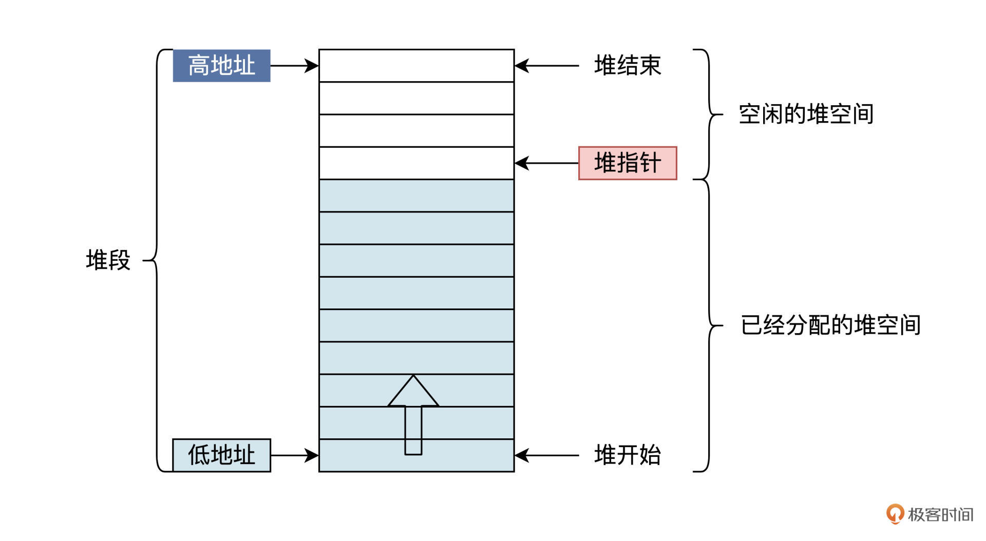 不过,我们今天要关注的重点,是操作系统为应用程序建立的堆。所以这节课要探讨的“堆”,不具有数据结构中对堆定义的完整特性,你可以只把它看作一个可以动态增加和减少大小的数组对象。