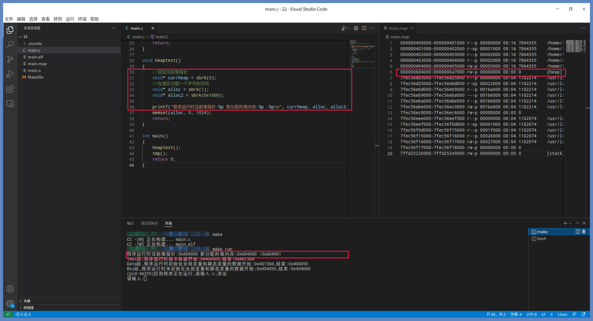 分配的地址也是从低到高,这也验证了我们之前所说的堆的增长方向。你也可以自行阅读Linux内核中,brk系统调用函数的代码进行考证,尽管内核代码中的细节很多,但核心逻辑和我们这里描述的相差无几。