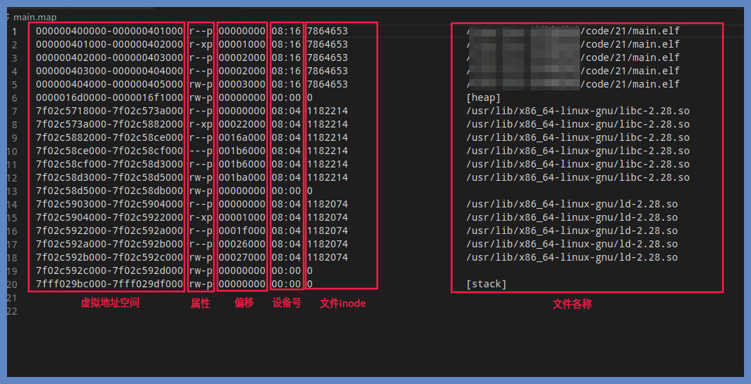 上述命令是我机器上的情况,59916是我运行程序后给出的pid,上述命令就是把/proc/59916/maps 或者 smaps 读取输出到main.map文件中,我们打开main.map文件,看到的情况如下图所示: