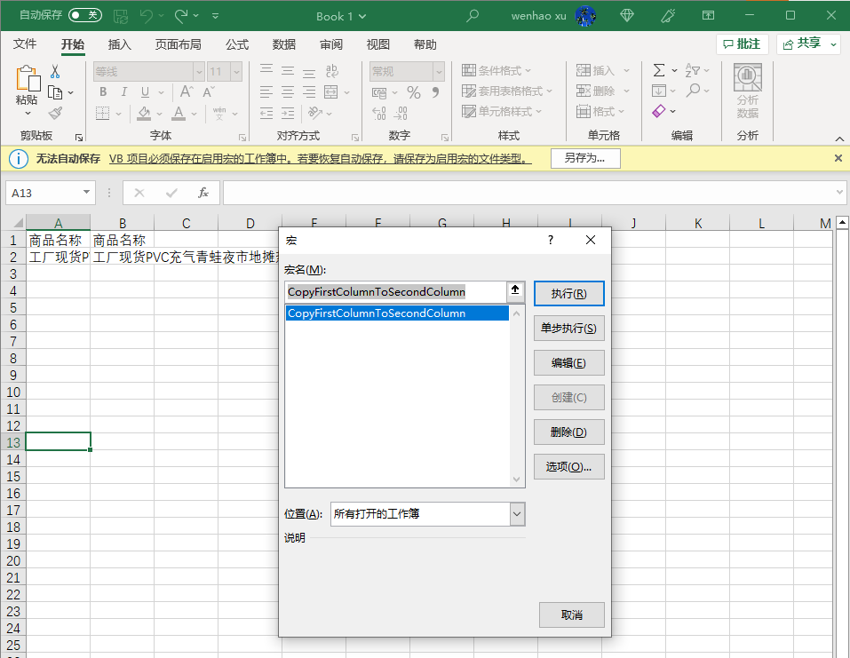 根据ChatGPT给出的详细操作步骤,我们可以通过快捷键 ALT + F11 打开Excel下的VBA编辑器,然后把对应的Excel代码复制进去;也能够在Excel的表格界面里,通过快捷键 ALT + F8 唤起宏的对话框,执行这段宏。你可以试一下,这段VBA的宏的确能够将我们表格里面的第一列,复制到第二列里面。