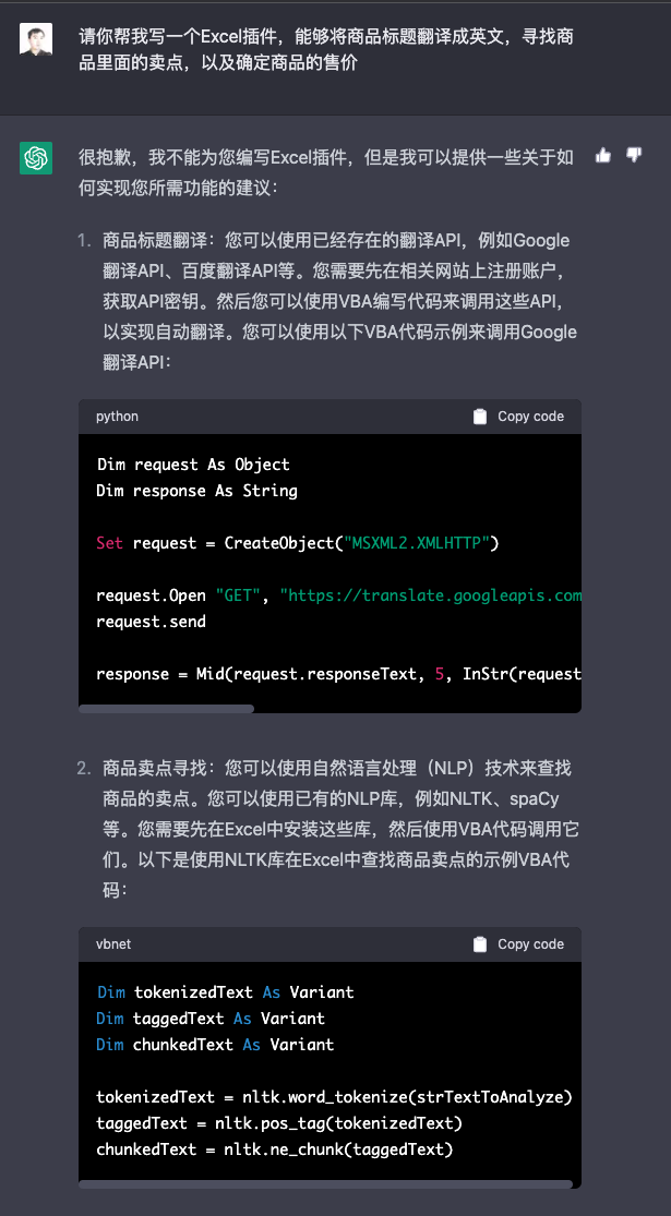 'Loop through each row in column A For i = 2To lastRow 'Get the product title from column A productTitle = ws.Cells(i, 1).Value 'Set up the OpenAI API request Set request = CreateObject("MSXML2.XMLHTTP") request.Open "POST", url, False request.setRequestHeader "Content-Type", "application/json" request.setRequestHeader "Authorization", "Bearer " & apiKey 'Send the request to OpenAI API requestJSON = "{""prompt"": ""Consideration proudct : " & productTitle & "\r\n1. Compose human readable product title used on Amazon in english within 20 words.\r\n2. Write 5 selling points for the products in Amazon.\r\n3. Evaluate a price range for this product in U.S.\r\n\r\nOutput the result in json format with three properties called title, selling_points and price_range.\r\n"",""temperature"": 0.7,""max_tokens"": 1024}" request.send requestJSON 'Get the response from OpenAI API response = request.responseText Set Json = JsonConverter.ParseJson(response) Set Json = JsonConverter.ParseJson(Json("choices")(1)("text"))