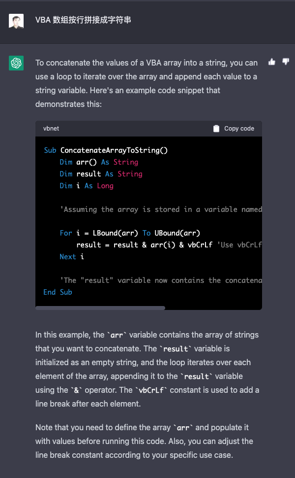 Function ConcatenateArrayToString(arr) AsString Dim result AsString Dim i AsLong 'Assuming the array is stored in a variable named "arr" For i = 1To5 result = result & arr(i) & vbCrLf 'Use vbCrLf to add a line break after each element Next i 'The "result" variable now contains the concatenated string ConcatenateArrayToString = result EndFunction