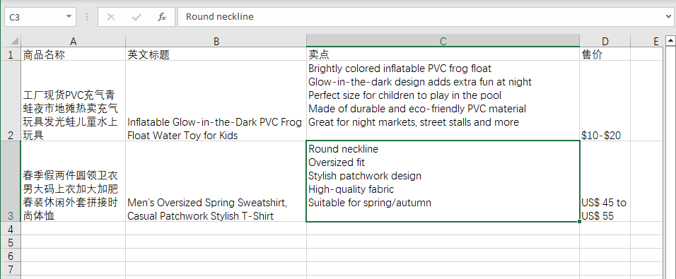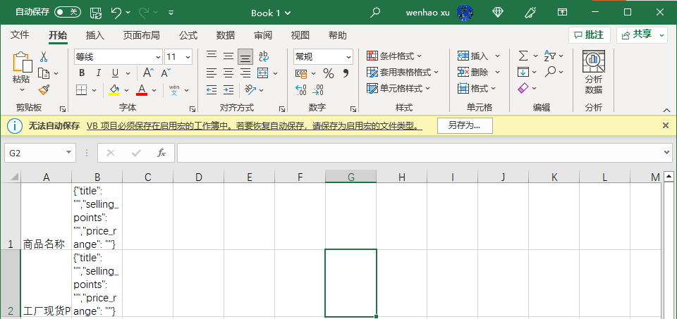…… 'Send the request to OpenAI API requestJSON = "{""prompt"": ""Consideration proudct : " & productTitle & vbNewLine & "1. Compose human readable product title used on Amazon in english within 20 words." & vbNewLine & "2. Write 5 selling points for the products in Amazon." & vbNewLine & "3. Evaluate a price range for this product in U.S." & vbNewLine & vbNewLine & "Output the result in json format with three properties called title, selling_points and price_range"",""temperature"": 0.7,""max_tokens"": 1024}" request.send requestJSON 'Get the response from OpenAI API response = request.responseText …… 'Insert the JSON output into column B ws.Cells(i, 2).Value = outputJSON ws.Cells(i, 3).Value = response ws.Cells(i, 4).Value = requestJSON ……
