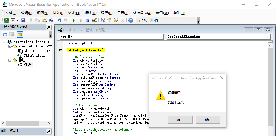 Sub GetOpenAIResults() 'Declare variables Dim wb As Workbook Dim ws As Worksheet Dim lastRow AsLong Dim i AsLong Dim productTitle AsString Dim response AsString Dim request AsObject Dim url AsString Dim apiKey AsString Dim requestJSON AsString Dim Json AsObject