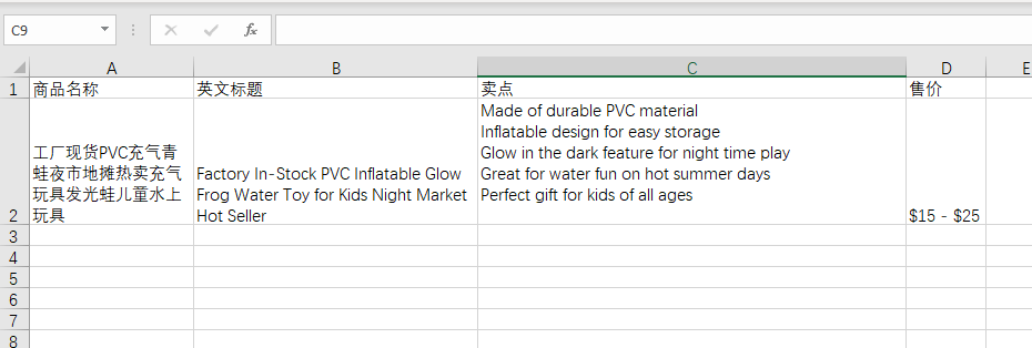prompt = """ Consideration proudct : 工厂现货PVC充气青蛙夜市地摊热卖充气玩具发光蛙儿童水上玩具 1. Compose human readable product title used on Amazon in english within 20 words. 2. Write 5 selling points for the products in Amazon. 3. Evaluate a price range for this product in U.S. Output the result in json format with three properties called title, selling_points and price_range """