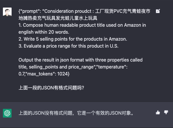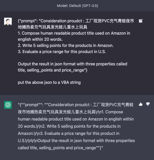 …… 'Send the request to OpenAI API requestJSON = "{""prompt"": ""Consideration proudct : " & productTitle & vbNewLine & "1. Compose human readable product title used on Amazon in english within 20 words." & vbNewLine & "2. Write 5 selling points for the products in Amazon." & vbNewLine & "3. Evaluate a price range for this product in U.S." & vbNewLine & vbNewLine & "Output the result in json format with three properties called title, selling_points and price_range"",""temperature"": 0.7,""max_tokens"": 1024}" requestJSON = "{""prompt"": ""Consideration proudct : 工厂现货PVC充气青蛙夜市地摊热卖充气玩具发光蛙儿童水上玩具\r\n1. Compose human readable product title used on Amazon in english within 20 words.\r\n2. Write 5 selling points for the products in Amazon.\r\n3. Evaluate a price range for this product in U.S.\r\n\r\nOutput the result in json format with three properties called title, selling_points and price_range""}" request.send requestJSON 'Get the response from OpenAI API response = request.responseText ……