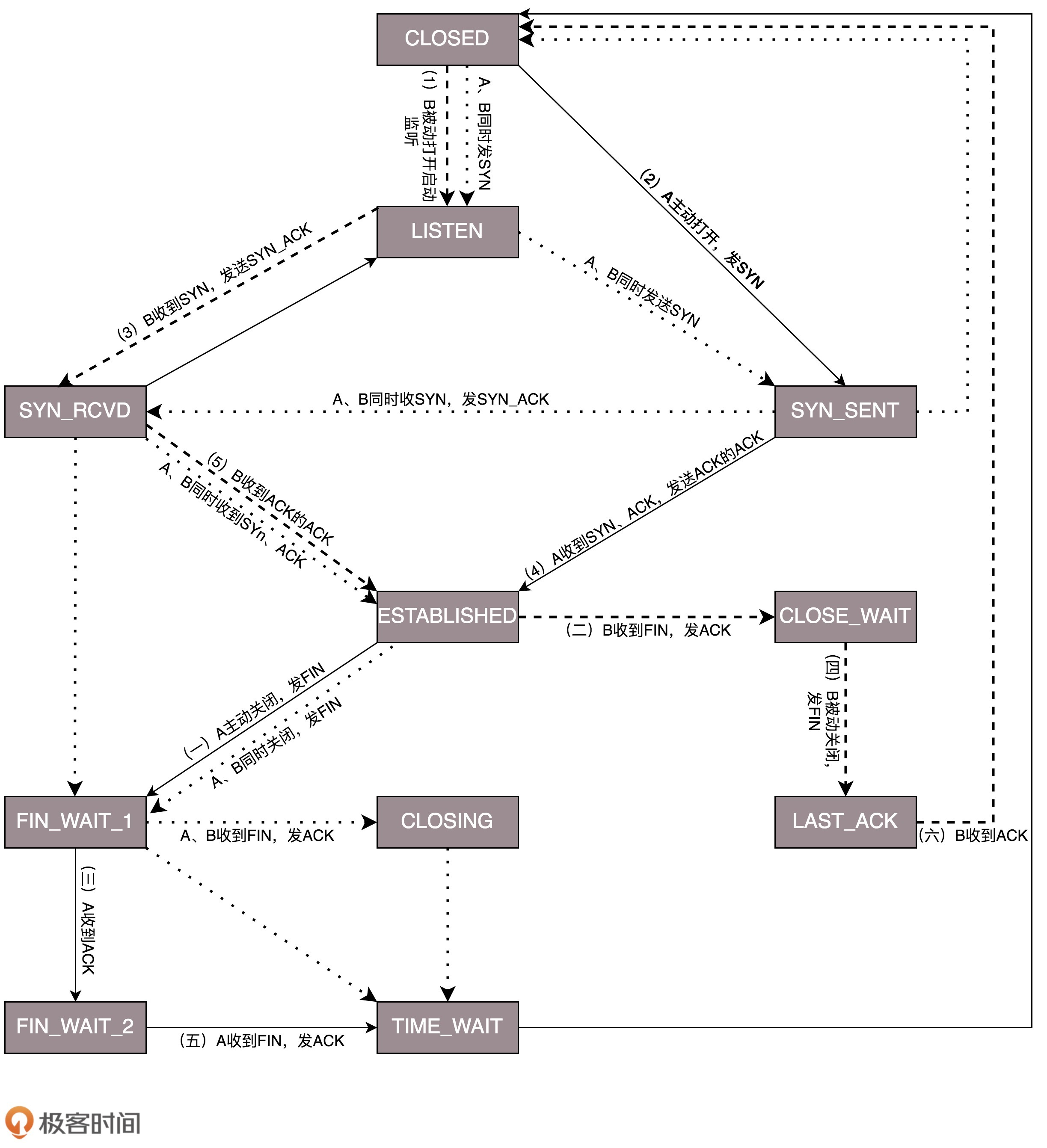 一开始,客户端和服务端都处于CLOSED状态。先是服务端主动监听某个端口,处于LISTEN状态。然后客户端主动发起连接SYN,之后处于SYN-SENT状态。服务端收到发起的连接,返回SYN,并且ACK客户端的SYN,之后处于SYN-RCVD状态。客户端收到服务端发送的SYN和ACK之后,发送ACK的ACK,之后处于ESTABLISHED状态,因为它一发一收成功了。服务端收到ACK的ACK之后,处于ESTABLISHED状态,因为它也一发一收了。