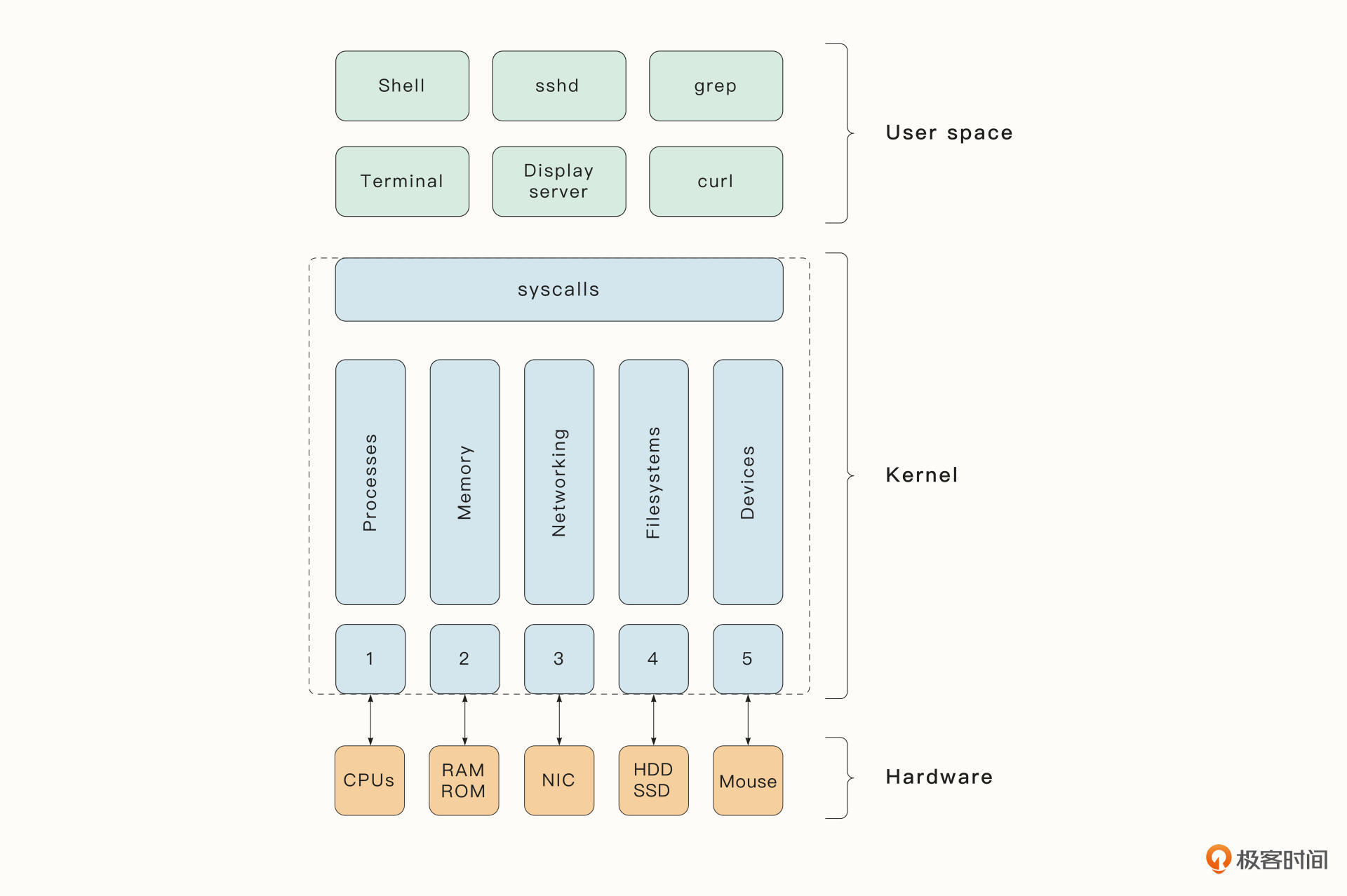 **要在操作系统层面解决瓶颈问题,我们要做的第二步是熟悉我们希望优化的操作系统的核心功能流程与架构,**从而才能有针对性地使用相关工具进行验证。例如,要排查CPU利用率过低的问题,需要明确操作系统如何将程序调度到CPU中执行、哪些问题可能导致CPU陷入等待或者发生切换、中断。