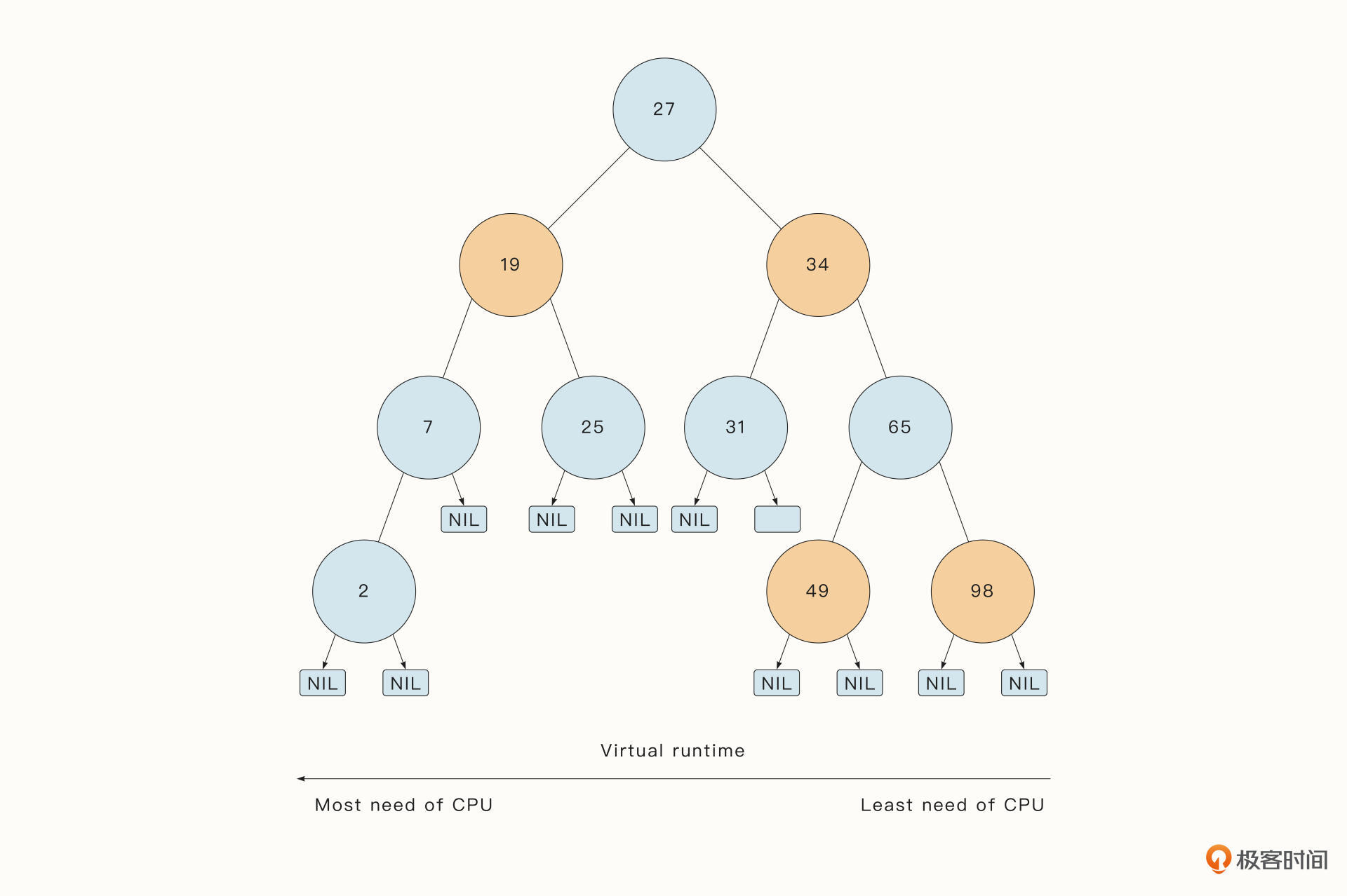 要解决这些问题,我们需要掌握相应的概念和知识,其中就包括了操作系统调度的原理。操作系统将程序分为了多个线程,并将线程调度到 CPU 上运行。为了公平地调度每一个线程,Linux2.6之后引入了CFS调度器,如下图所示。线程按照运行的优先级存储在红黑树结构中,红黑树中最左侧的线程会优先被调度执行。