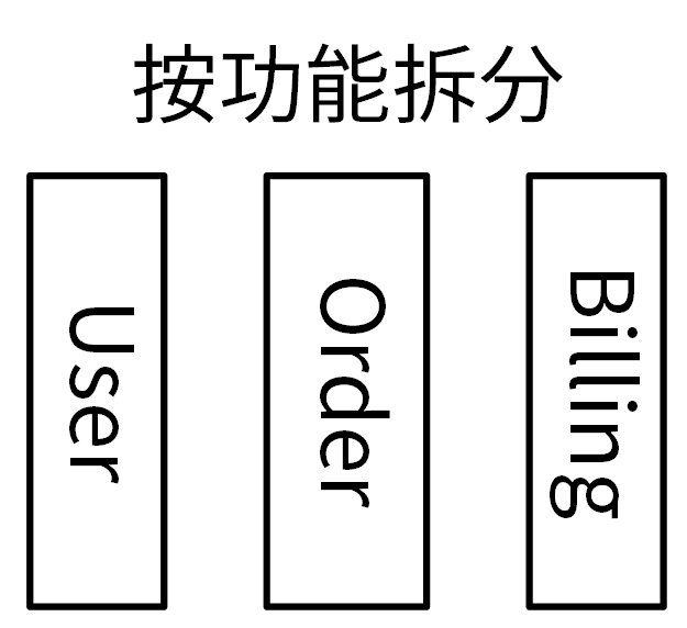 那什么是按功能拆分呢?我给你看一个例子你就明白了。比如,一个订单系统,我们可以根据不同功能将其拆分成用户(user)、订单(order)和计费(billing)3个模块,每一个模块提供独立的功能,功能更单一:
