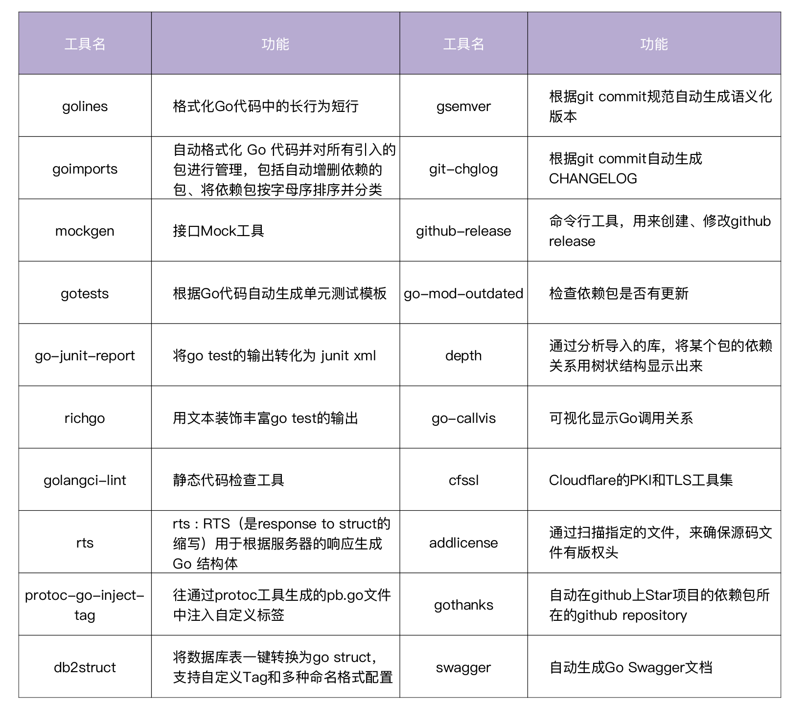 那么,Go项目中,有哪些工具可以为我们所用呢?这里,我给你整理了一些有用的工具: