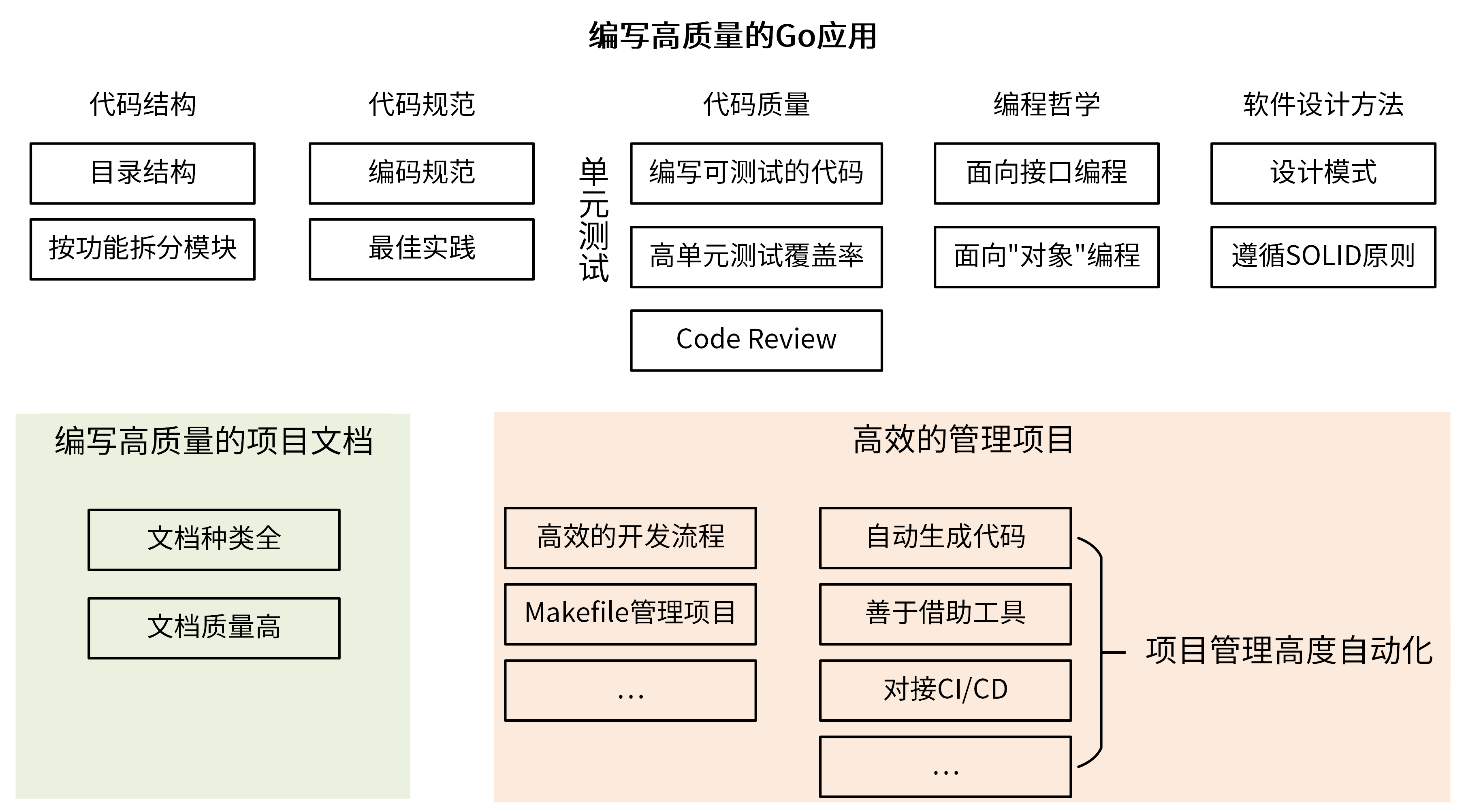 基于我的研发经验,要编写一个高质量的Go应用,其实可以归纳为5个方面:代码结构、代码规范、代码质量、编程哲学和软件设计方法,见下图。