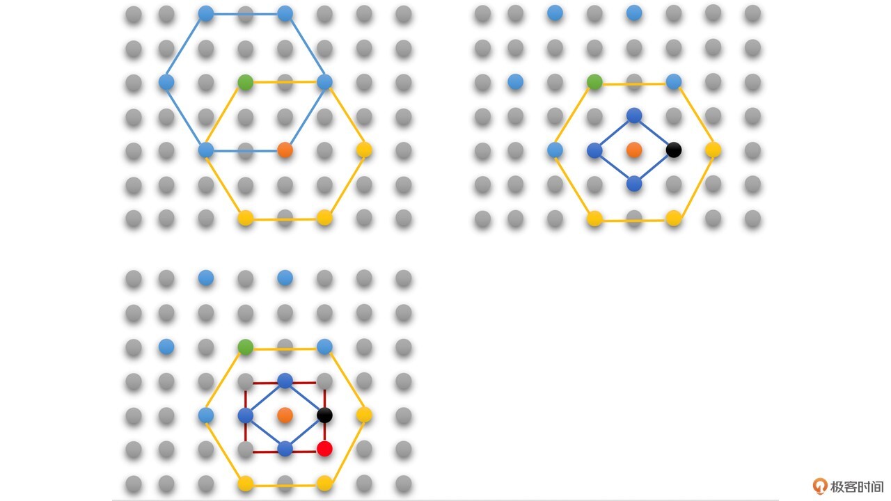 六边形搜索跟钻石搜索差不多,只是搜索模式是六边形的。我们还是以亮度16 x 16的块为例来介绍一下,主要有下面几个步骤:
