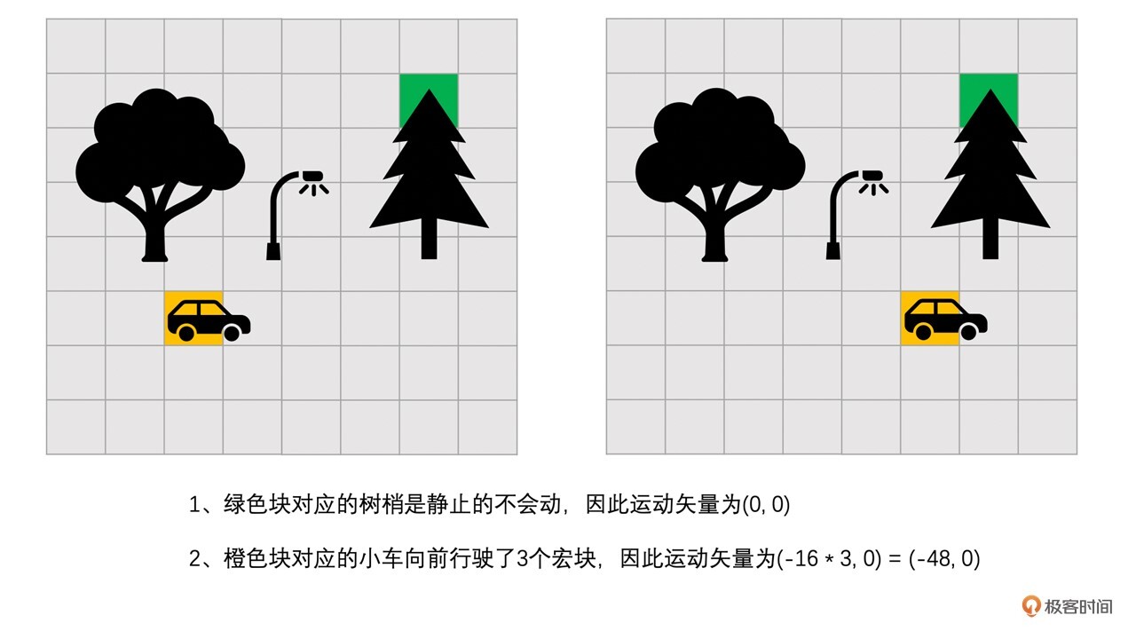 或者从编码的角度来讲,右边图像中橙色块的内容跟左边图像中橙色块的内容基本一样。很明显,如果以左边图像为参考帧的话,那么左边图像中的橙色块就是最合适的预测块,但是左右两幅图像橙色块的位置很明显又不同,而这种不同是因为图像中的小车的运动引起的。因此,为了表示这种变化,我们用运动矢量来表示编码帧中编码块和参考帧中的预测块之间的位置的差值。