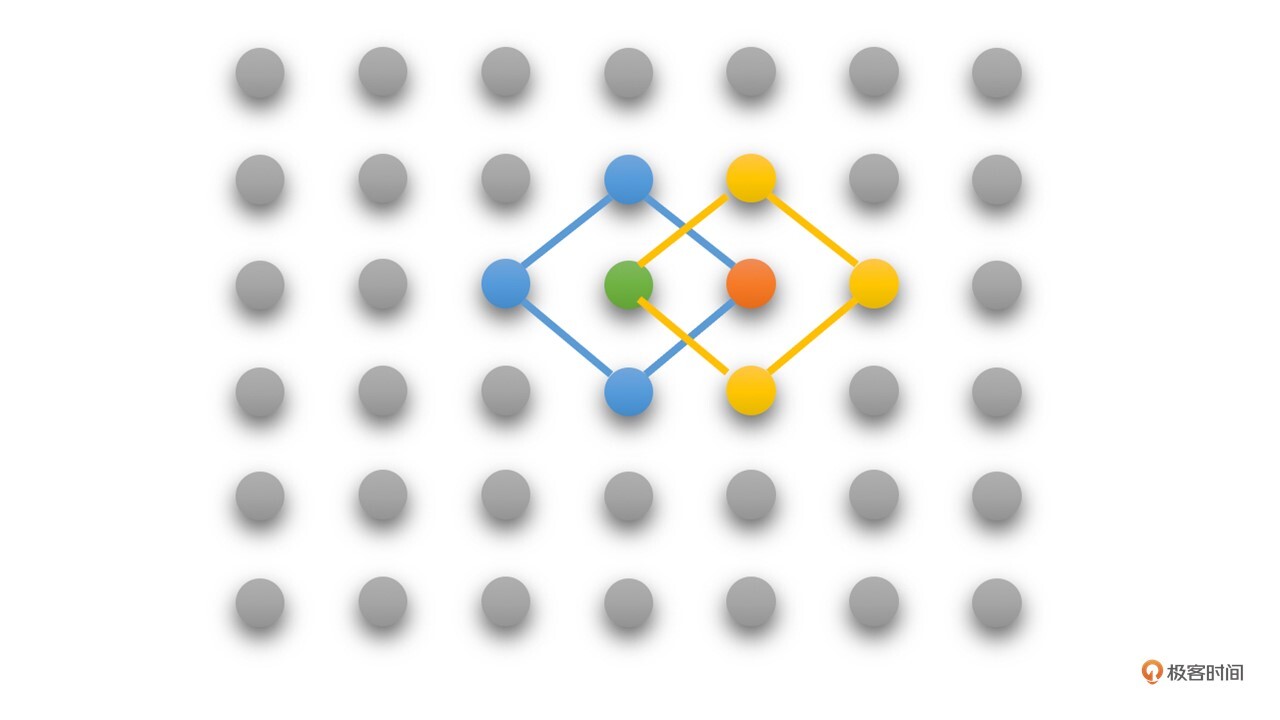 第一步,以绿色点(起点)为中心点,搜索绿色点和旁边蓝色线连接的4个点,得到的最佳匹配点为橙色点,非中心点。