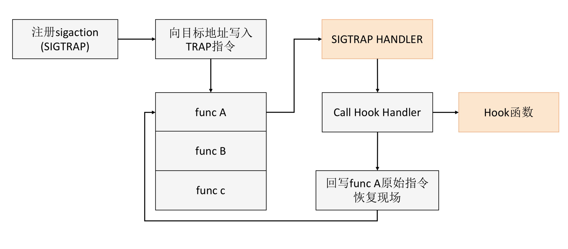 业界也有不少人将Trap Hook叫作断点Hook,它的原理就是在需要Hook的地方想办法触发断点,并捕获异常。一般我们会利用SIGTRAP或者SIGKILL(非法指令异常)这两种信号。下面以SIGTRAP信号为例,具体的实现步骤如下。
