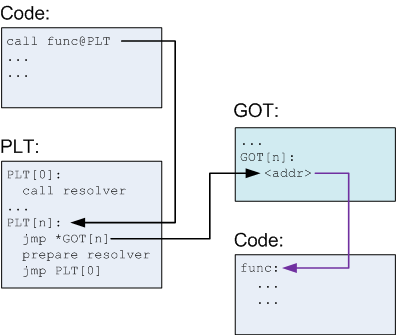 在解析前GOT[n]会直接指向jmp *GOT[n]的下一条指令。在解析完成后,我们就得到了func的实际地址,动态加载器会将这个地址填入GOT[n],然后调用func。