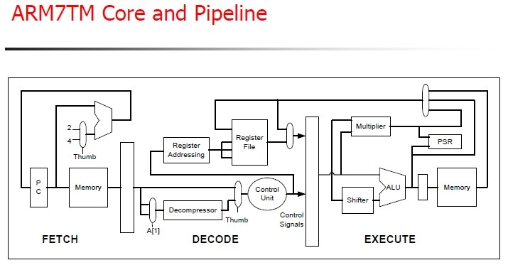 ARMv7中有一种广为流传的$PC=$PC+8的说法。这是指ARMv7中的三级流水线(取指、解码、执行),换句话说$PC寄存器总是指向正在取指的指令,而不是指向正在执行的指令。取指总会比执行快2个指令,在ARM32指令集下2个指令的长度为8个字节,所以$PC寄存器的值总是比当前指令地址要大8。