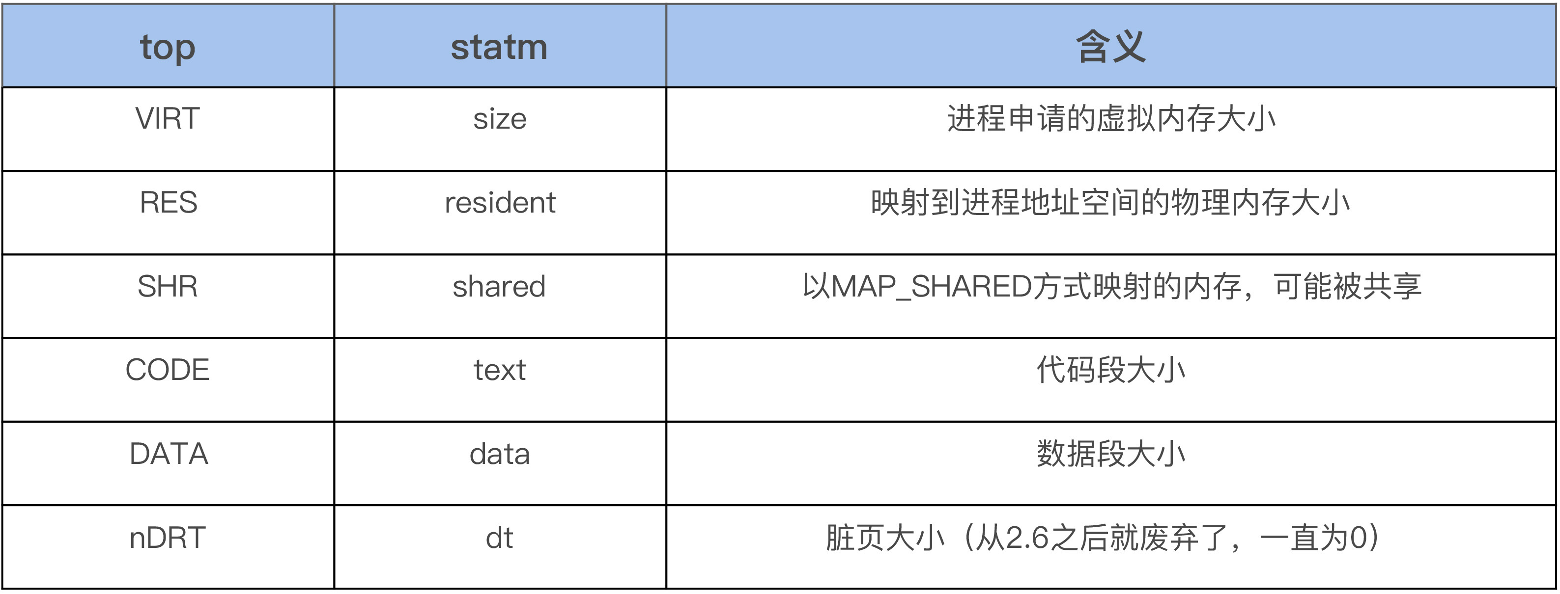 除了nMaj(Major Page Fault, 主缺页中断,指内容不在内存中然后从磁盘中来读取的页数)外,%MEM则是从RES计算而来的,其余的内存信息都是从statm文件里面读取的,如下是top命令中的字段和statm中字段的对应关系: