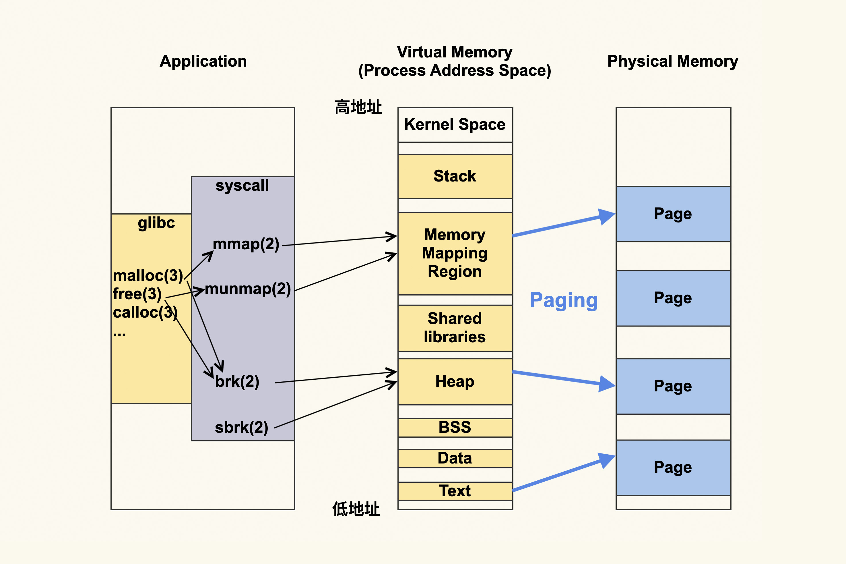 如果使用的是库函数,这些库函数其实最终也是对系统调用的封装,所以可以理解为是应用程序动态申请释放内存,最终是要经过mmap(2)、munmap(2)、brk(2)、sbrk(2)等这些系统调用。当然从库函数到系统调用,这其中还涉及到这些库本身进行的一些内存层面的优化,比如说,malloc(3)既可能调用mmap(2),又可能会调用brk(2)。