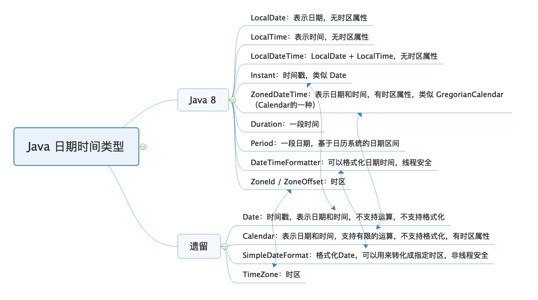 如果有条件的话,我还是建议全面改为使用Java 8的日期时间类型。我把Java 8前后的日期时间类型,汇总到了一张思维导图上,图中箭头代表的是新老类型在概念上等价的类型:
