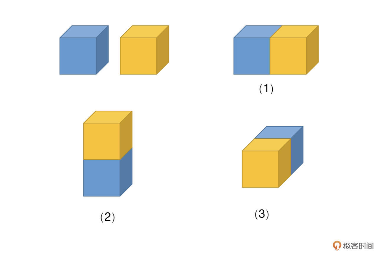 第二个参数是dim,我们回忆一下Tensor的定义,Tensor的维度(秩)是有多种情况的。比如有两个3维的Tensor,可以有几种不同的拼接方式(如下图),dim参数就可以对此作出约定。